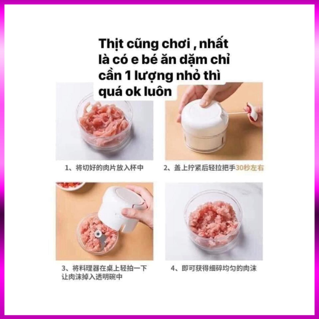 - Cực dễ dàng, chỉ cần cho đồ vào, đậy nắp, kéo & thả phần dây kéo liên tục, dây kéo sẽ làm quay lưỡi cắt bên trong, xay nhuyễn đồ ăn không hề vất vả. Dùng được mọi lúc mọi nơi, ko cần điện.