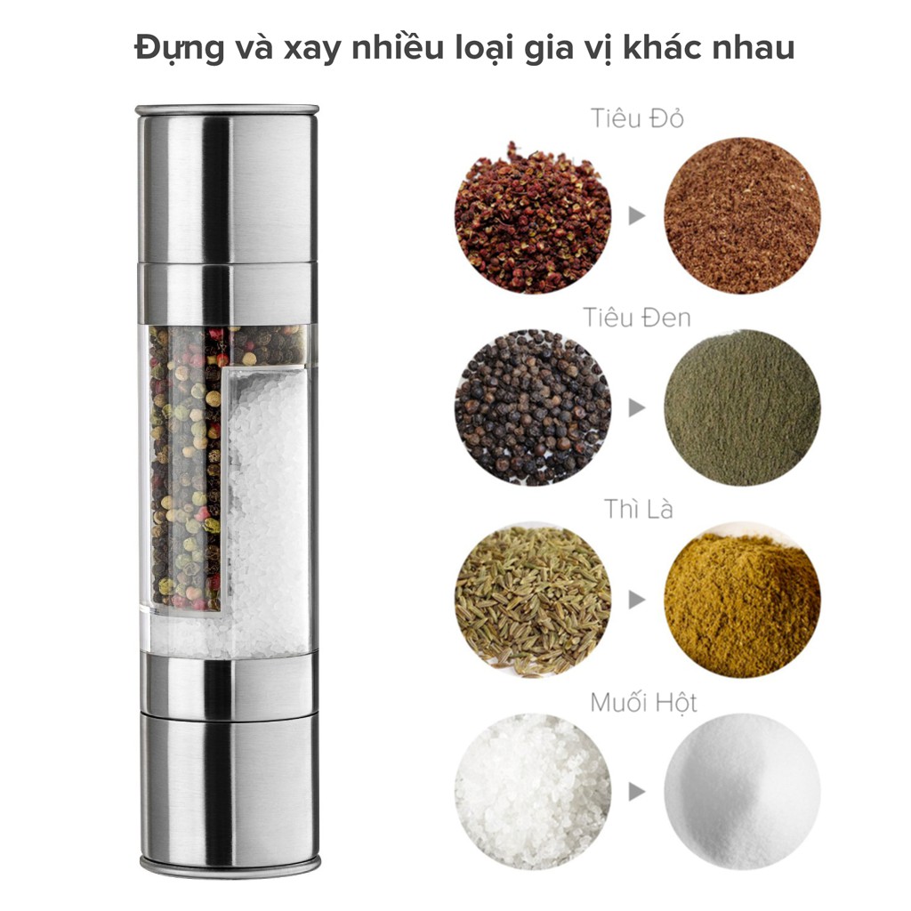 - Với thiết kế 02 đầu kép, dụng cụ có thể được sử dụng cho các loại gia vị khác nhau. Phần nắp ở 02 đầu cũng là phần chứa lưỡi xay, được bao bọc bởi lớp inox sáng bóng không chỉ bền chắc mà còn giúp thao tác xoay nắp nghiền gia vị được trơn tru và dễ dàng hơn.