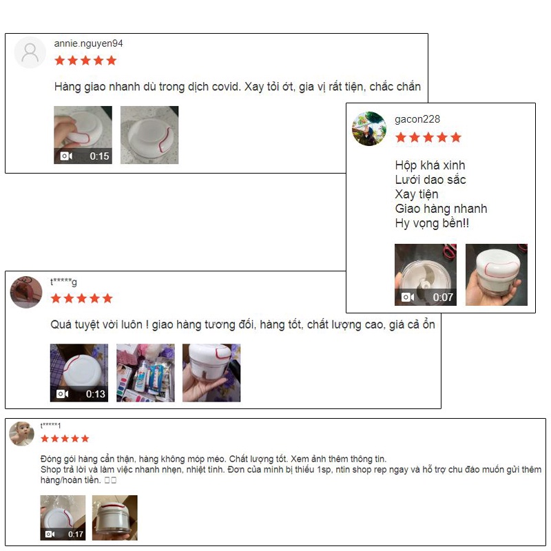 – Chỉ cần cho thực phẩm vào hộp, đậy nắp lại và giữ chắc thân hộp bằng một tay, tay còn lại thì cầm vào tay kéo màu trắng phía trên nắp hộp và kéo ra thu vào liên tục cho đến khi thực phẩm nhuyễn vừa ý