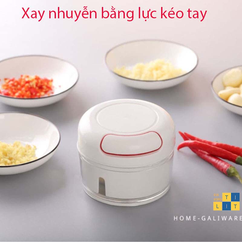 Dụng cụ xay tỏi ớt la loại dụng cụ kéo bằng tay rất hiệu quả vì sản phẩm nhanh chóng được làm dập, nhuyễn theo ý muốn và hoàn toàn dùng bằng lực kéo nhẹ nhàng nhưng cho vòng quay nhanh và nhiều.