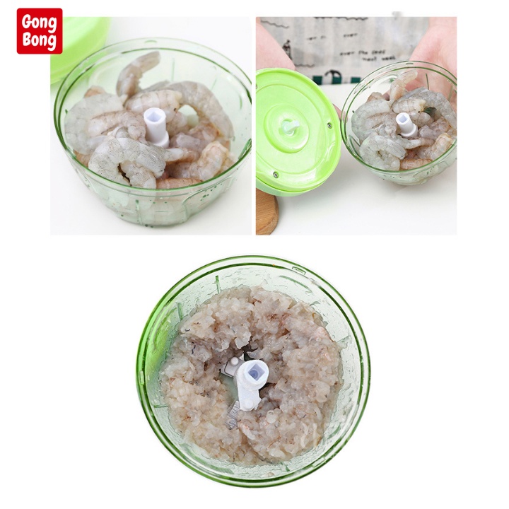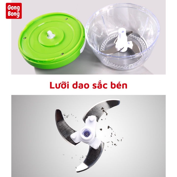- Bỏ thực phẩm bên trong, nắp chắc chắn, sau đó kéo dây kéo và thả. (Chú ý là kéo gần hết cót) - Lưỡi dao sẽ xoay và băm nhỏ thực phẩm