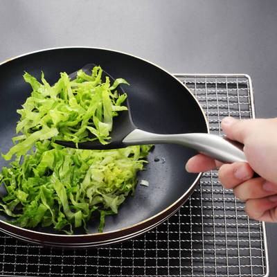 Dụng Cụ Xẻng Lật Thực Phẩm Bằng Silicon Có Tay Cầm Bằng Thép Không Gỉ Chắc ChắnLàm bằng inox 304 và chất liệu silicone nên không dễ han gỉ, an toàn khi sử dụng khi đun nấu.