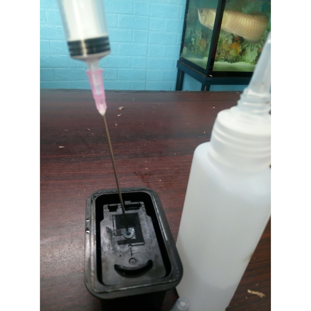 1. Súc rửa : Phải súc rửa sạch mực hiện có trong vòi phun bị nghẹt, dùng kít (ống tiêm xilanh nhưng bỏ cây kim nhọn đi) cắm vào đầu vòi rút ngược không khí vài lần, dùng kit có nước rửa bơm vào vòi và lại rút ngược trở lên.