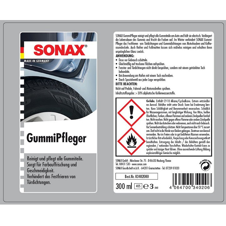 - Chai xịt bảo dưỡng cao su Sonax Rubber Protectant renovador de gomas 300ml, sản phẩm chứa hoạt chất bảo vệ, giúp bảo vệ bề mặt cao su, giữ cho lốp xe, các chi tiết cao su mềm mại, chống nứt.