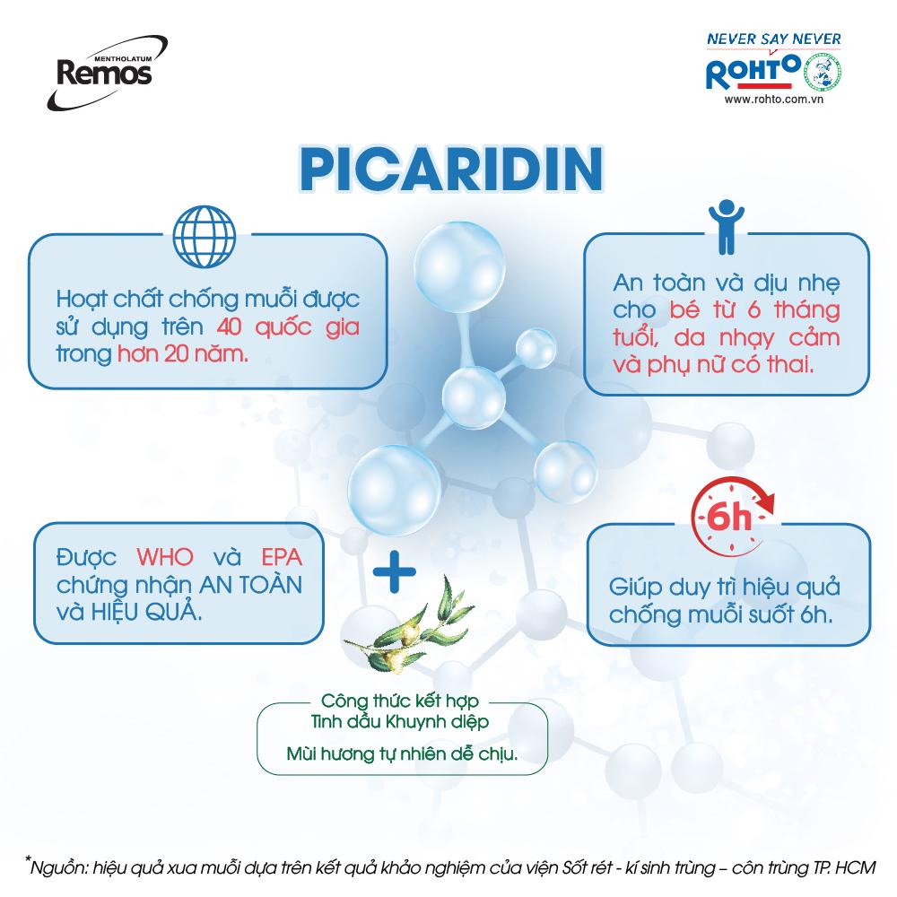 Thành phần Picaridin được WHO và EPA chứng nhận là an toàn và hiệu quả để xua đuổi muỗi.