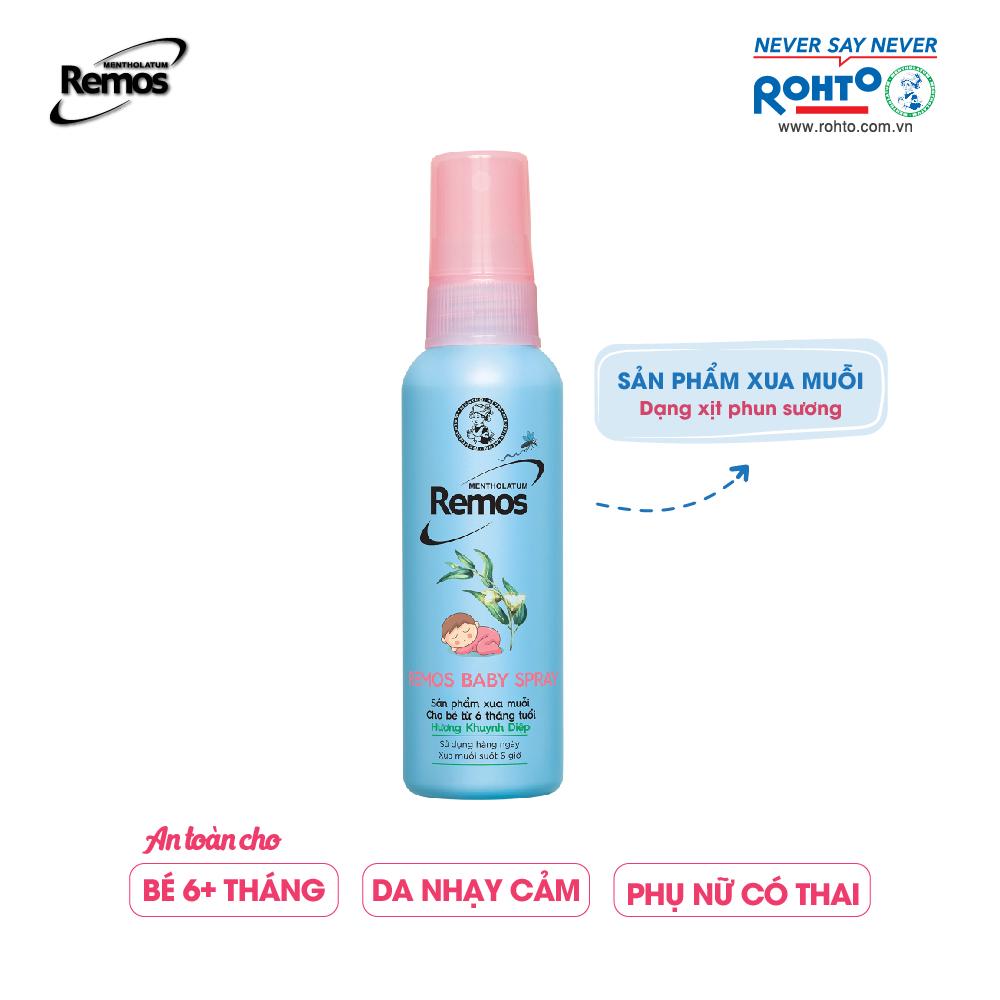 Dung dịch chống muỗi cho bé từ 6 tháng tuổi Remos Mentholatum hương khuynh diệp 60mlRemos Baby là sản phẩm đầu tiên tại Việt Nam sử dụng hoạt chất Picaridin để chống muỗi an toàn và hiệu quả.