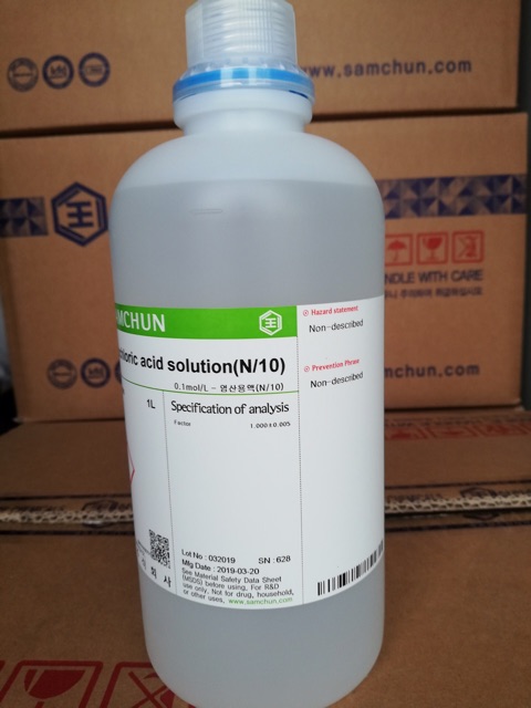 Dung dịch chuẩn độ 0.1mol/L Hydrochloric aci.d N/10 HCl 0.1N Samchun Hàn Quốc chai 1 lít H0416 dung dịch chuẩn