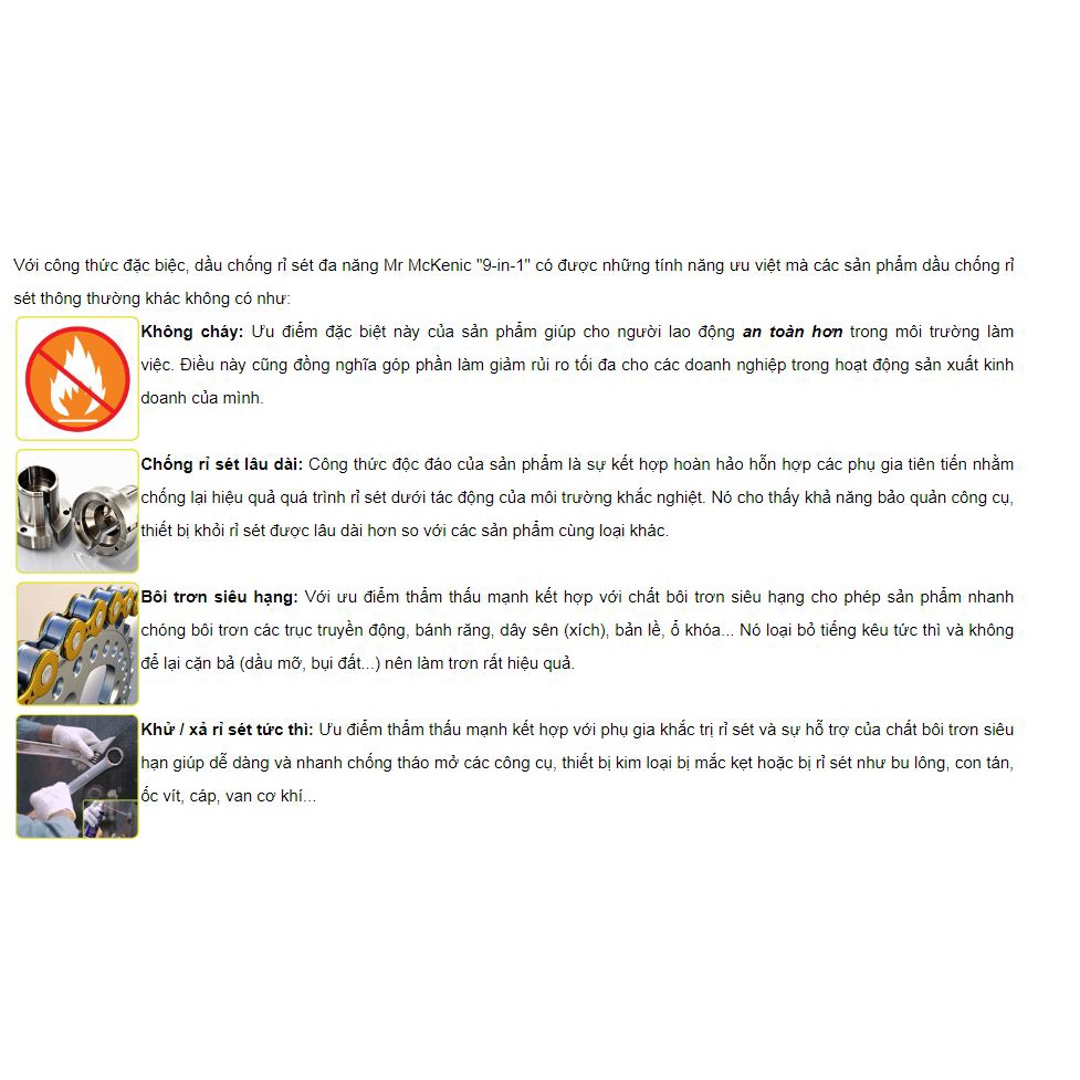 Với công thức đặc biệc, dầu chống rỉ sét đa năng Mr McKenic "9-in-1" có được những tính năng ưu việt mà các sản phẩm dầu chống rỉ sét thông thường khác không có như: