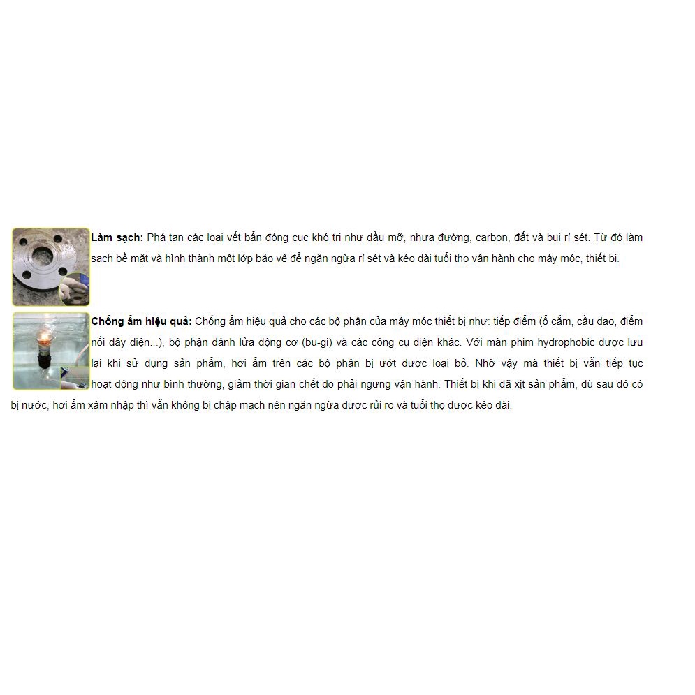 Chống ẩm hiệu quả: Chống ẩm hiệu quả cho các bộ phận của máy móc thiết bị như: tiếp điểm (ổ cắm, cầu dao, điểm nối dây điện...), bộ phận đánh lửa động cơ (bu-gi) và các công cụ điện khác. Với màn phim hydrophobic được lưu lại khi sử dụng sản phẩm, hơi ẩm trên các bộ phận bị ướt được loại bỏ. Nhờ vậy mà thiết bị vẫn tiếp tục hoạt động như bình thường, giảm thời gian chết do phải ngưng vận hành. Thiết bị khi đã xịt sản phẩm, dù sau đó có bị nước, hơi ẩm xâm nhập thì vẫn không bị chập mạch nên ngăn ngừa được rủi ro và tuổi thọ được kéo dài.