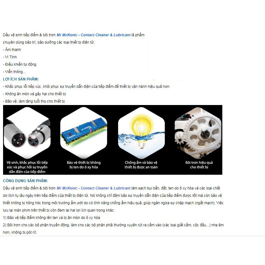 Dầu vệ sinh tiếp điểm & bôi trơn Mr McKenic - Contact Cleaner & Lubricant làm sạch bụi bẩn, đất, ten do ô xy hóa và các loại chất dơ tích tụ lâu ngày trên tiếp điểm của thiết bị điện tử. Nó không chỉ đảm bảo sự truyền dẫn điện của tiếp điểm được tốt mà còn bảo vệ thiết không bị hỏng hóc trong môi trường ẩm ướt do có tính năng chống ẩm hiệu quả, giúp ngăn ngừa sự chập mạch (ngắt mạch). Việc lưu lại màn phim trên thiết bị còn đem lại hai lợi ích quan trọng khác: