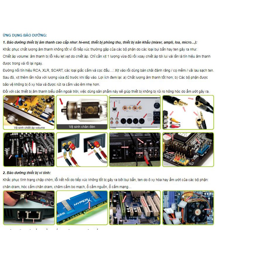 Đường nối tín hiệu RCA, XLR, SCART, các loại giắc cắm và cọc đấu…: Xịt vào rồi dùng bàn chải đánh răng / cọ mềm / vải lau sạch ten. Sau đó, xịt thêm lần nữa với lượng vừa đủ trước khi lắp vào. Lợi ích đem lại: a) Chất lượng âm thanh tốt hơn; b) Các bộ phận được bảo vệ không bị ô xy hóa và được rút ra cắm vào êm nhẹ hơn.