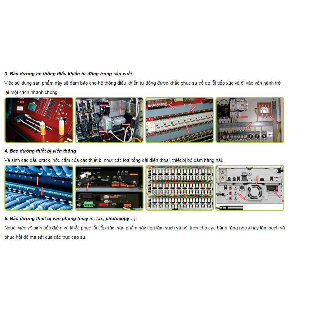 Ngoài việc vệ sinh tiếp điểm và khắc phục lỗi tiếp xúc, sản phẩm này còn làm sạch và bôi trơn cho các bánh răng nhựa hay làm sạch và phục hồi độ ma sát của các trục cao su.