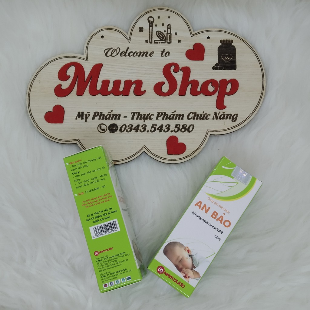 Thành phần của dung dịch thảo dược An BảoMỗi lọ 12 ml có chứa: Bạch hoa xà 1g; Hoàng bá nam 1g; Khổ luyện diệp 1g; Nghệ vàng 1g; Dung môi vừa đủ 12ml.