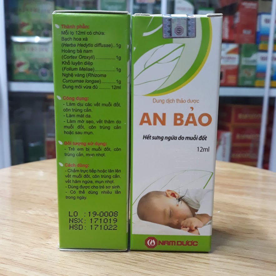 - Dung dịch thảo dược An Bảo được bào chế từ bài thuốc nam có tác dụng sát khuẩn, chống viêm, tiêu độc, tiêu sưng, tái tạo tế bào da, giúp hết sưng, ngứa do muỗi đốt, côn trùng cắn, dùng được cho trẻ sơ sinh.- An Bảo giúp làm xẹp nhanh mụn trứng cá mà không làm hại da, khô da, đặc biệt không để lại sẹo, vết thâm