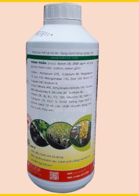 Vitamin (B1, B2, B12, C) (ppm): 100, Glucoza 50, NAA 10, Cytokynin 10, OLC 5, Chất tương hợp NVP 5, EDDHA (red) 10 và các chất chuyên dùng cho thủy canh, thủy sinh.