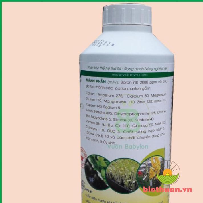 + Vitamin (B1, B2, B12, C) (ppm): 100, Glucoza 50, NAA 10, Cytokynin 10, OLC 5, Chất tương hợp NVP 5, EDDHA (red) 10 và các chất chuyên dùng cho thủy canh, thủy sinh.