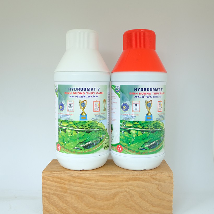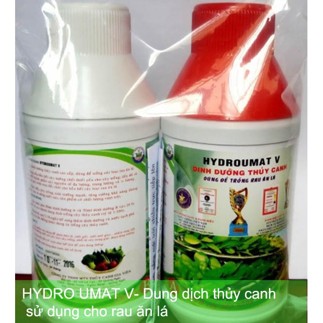 Bộ 2 chai dung dịch thuỷ canh cao cấp Hydro Umat V chai 500ml chuyên dùng cho rau ăn lá. và Hydro Umat F chai 500ml cho cây ăn quảBộ sản phẩm bao gồm 2 chai 500ml: Group A và Group B