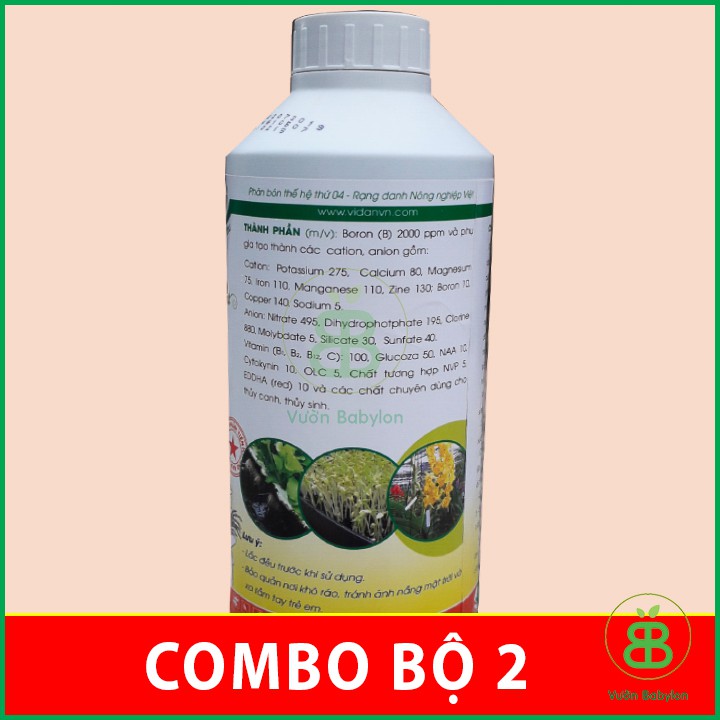 + Vitamin (B1, B2, B12, C) (ppm): 100, Glucoza 50, NAA 10, Cytokynin 10, OLC 5, Chất tương hợp NVP 5, EDDHA (red) 10 và các chất chuyên dùng cho thủy canh, thủy sinh.