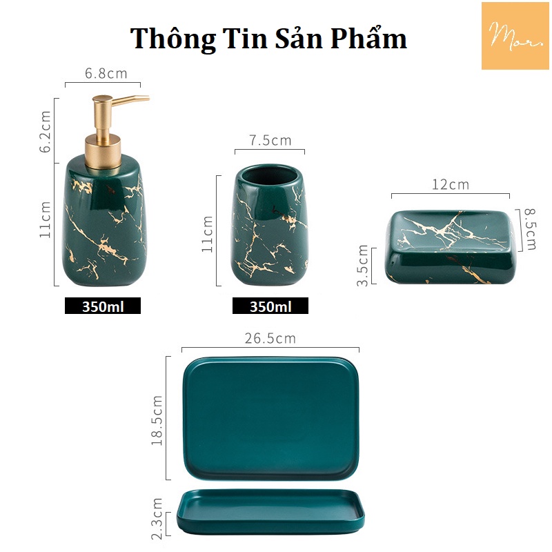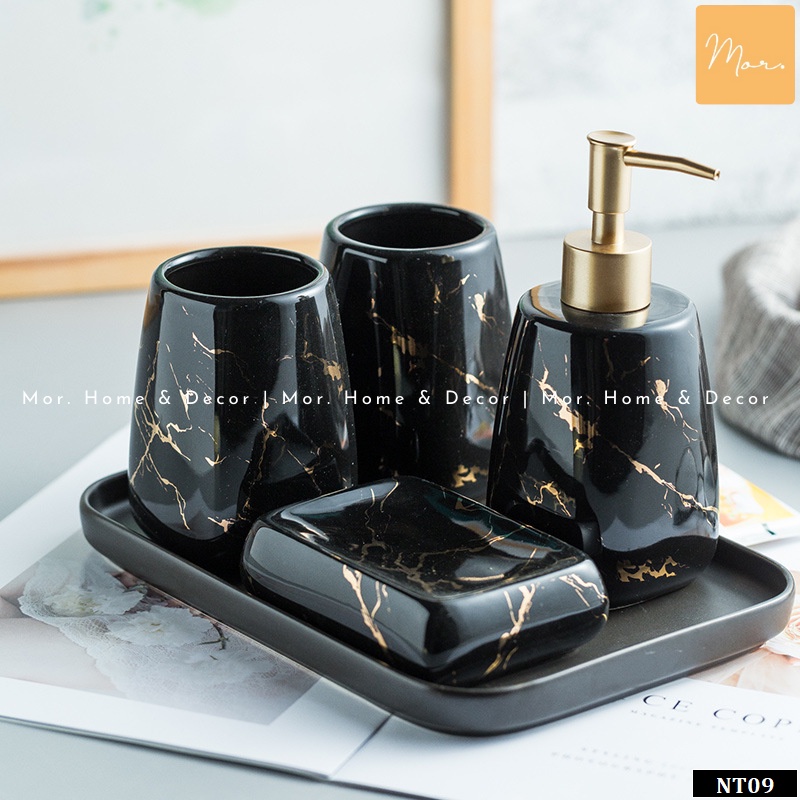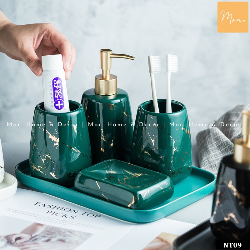 Bộ đồ dùng nhà tắm sứ cao cấp - NT09- Bộ sản phẩm gồm cốc đánh răng, cốc đựng kem đánh răng, lọ đựng nước rửa tay, khay đựng xà phòng giúp không gian nhà tắm ngăn nắp, khoa học