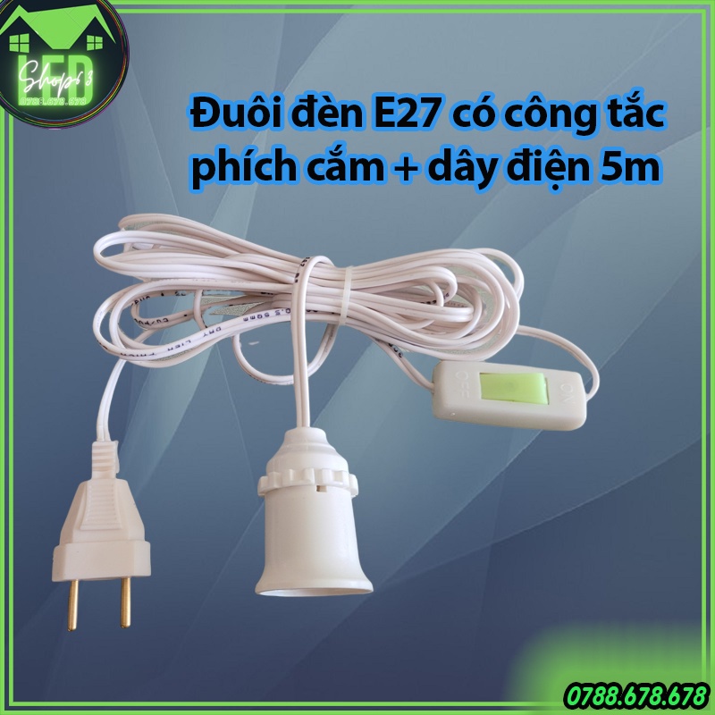 Đuôi đèn E27 chống cháy cao cấp - gồm dây dài 5m có kèm công tắc (đuôi xoáy 27 - nguyên bộ như hình)