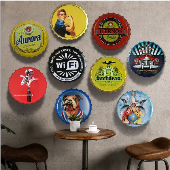 Bạn đang cần decor không gian quán, shop, nhà riêng,… theo phong cách cổ điển vintage, retro pha lẫn hiện đại phá cách. Nổi bật trong các vật dụng trang trí đó chính là dòng sản phẩm Nắp chai bia (nắp ve) trang trí tường 40cmNắp chai decor 40cm đa dạng các hình ảnh, phù hợp với các nhu cầu trang trí: nhà hàng, beer club, quán nhậu, quán cafe, tiệm trà sữa, tiệm tóc barber, tiệm xăm tattoo,…
