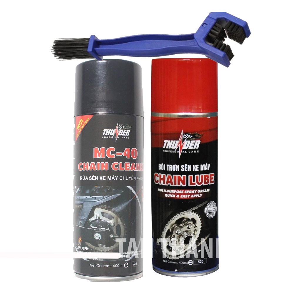 Combo Dưỡng Rửa Cọ chà sên Cao Cấp Thunder,dưỡng sên thunder, xịt sên thunder-PTTTGiới thiệu sản phẩm Bộ sản phẩm vệ sinh sên MC-40 400ml, Bôi trơn dưỡng sên Thunder Chain Lube 400ml và bàn chải sên chuyên nghiệp