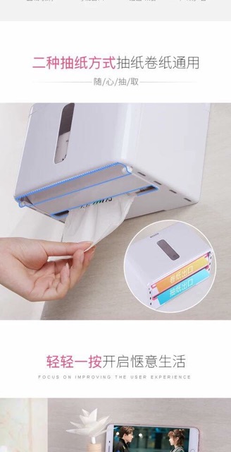 Thiết bị gia dụng thông minh-tiện ích-thân thiện với môi trườngHộp đựng giấy vệ sinh; chống ướt giấy; chịu tải lực lên đến 10kg; có vị trí để đặt đồ đạc; gắn vào tường nhà vệ sinh bằng miếng dán chuyên dụng 2 mặt.
