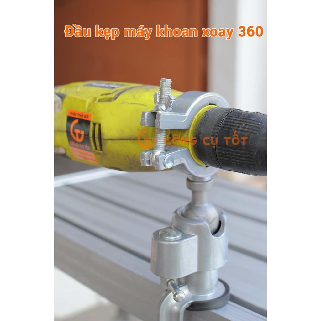 Ê tô xoay 360 độ làm băng hợp kim nhôm, chắc chắn giúp bạn kẹp và đỡ máy khoan tay, máy mài, máy khắc cầm tay ... không bị mỏi tay, thao tác chuẩn hơn khi gia công những chi tiết nhỏ, cần độ chính xác cao.Hiện nay công việc thủ công mỹ nghê, gia công đồ dùng cần phải sử dụng đến máy khoan, máy mài, máy cắt cầm tay... dần trở nên phổ biến nhưng do sức nặng của máy móc khiến việc gia công trở nên khó khăn hơn rất nhiều. Đặc biệt mới con gái thì việc cầm 1 chiếc máy nặng cỡ 1000g thì càng khó khăn hơn để có thể điều khiển máy móc theo hướng mình muốn. Vì vậy chiếc ê tô xoay 360 độ có thể giữ và kẹp máy khoan, máy cắt... trở thành trợ thủ đắc lực cho người thợ thủ công. Vừa giúp họ nâng máy khoan không lo mỏi tay lại có thể điều khiển xoay máy khoan theo các hướng mong muốn giúp công việc gia công trở nên dễ dàng và chính xác hơn
