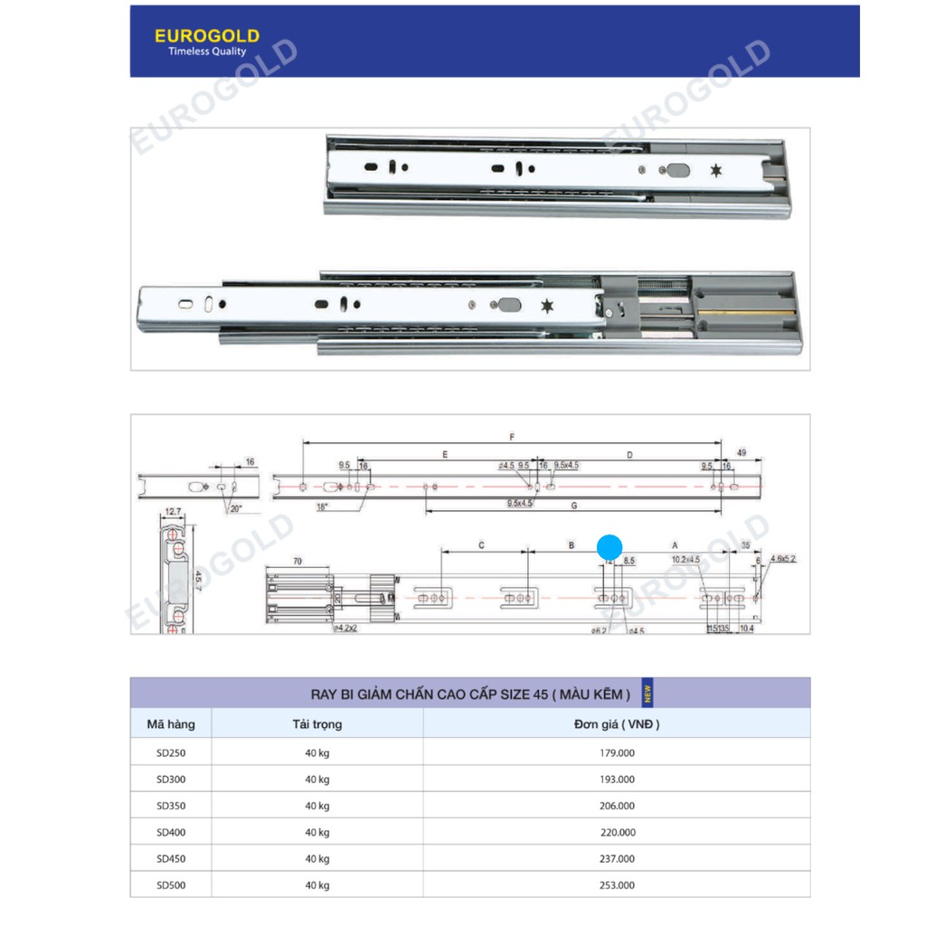 ✔️ THÔNG TIN SẢN PHẨM Ray Trượt Bi 3 Tầng Giảm Chấn Eurogold:
