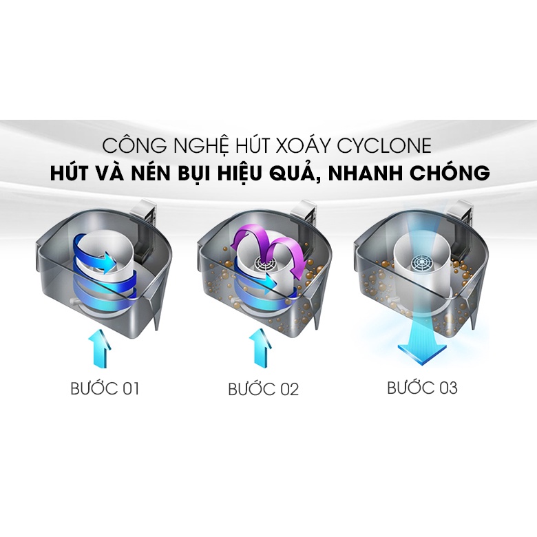 - Hút bụi mạnh mẽ, nhanh chóng với công nghệ Cyclone hiện đại. Bộ lọc EPA 10 3 lớp ngăn được đến hơn 90% chất bẩn