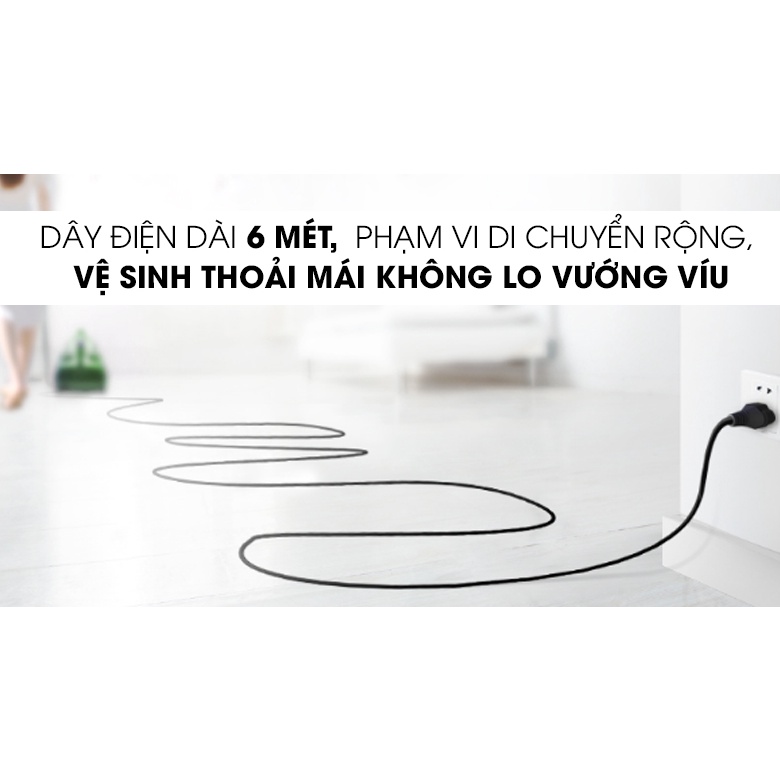 - Máy hút bụi dạng hộp có dây điện dài đến 6 mét, cho phạm vi di chuyển rộng, vệ sinh thoải mái không lo vướng víu