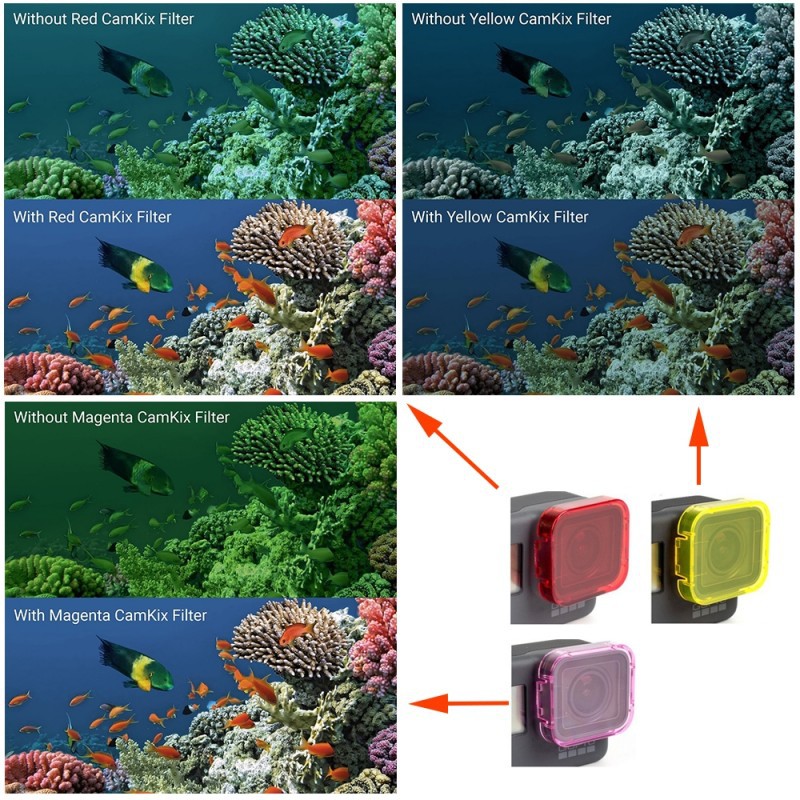 Filter màu cho máy GoPro Hero 5, GoPro Hero 6, GoPro Hero 7, GoPro new hero 2018Bộ Filter này được thiết kế cho những người lặn quay chụp dưới nước, do sóng khúc xạ, hình ảnh được chụp dưới nước có thể bị biến dạng màu sắc. Sử dụng bộ lọc này giúp hiệu chỉnh, hình ảnh được chụp dưới nước sẽ được sống động hơn và tự nhiên hơn.