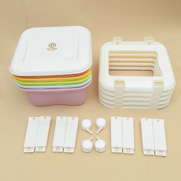 - Màu sắc các tầng: Xanh lá, Xanh nước Biển, Vàng, Cam, Hồng. Một Sản phẩm gồm 5 tầng, đủ các, màu như trên.