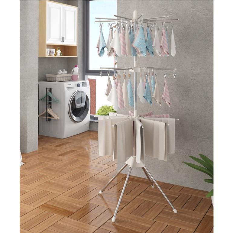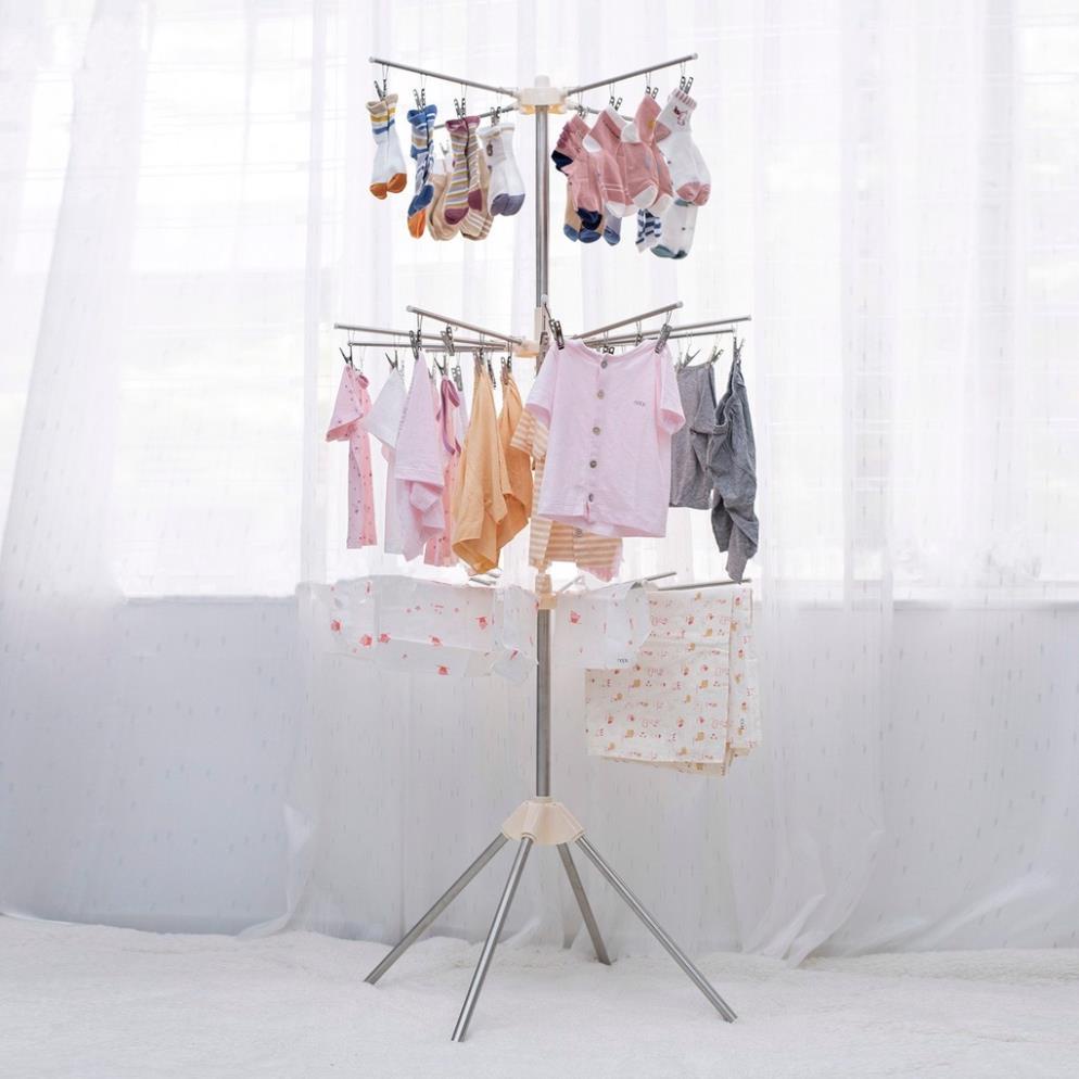 - Cây phơi quần áo 3 tầng với 3 giá phơi đồ cực kì chắc chắn và tiện dụng, có thể gập gọn khi không sử dụng, móc trùm có thể tháo rời làm 1 móc treo khác