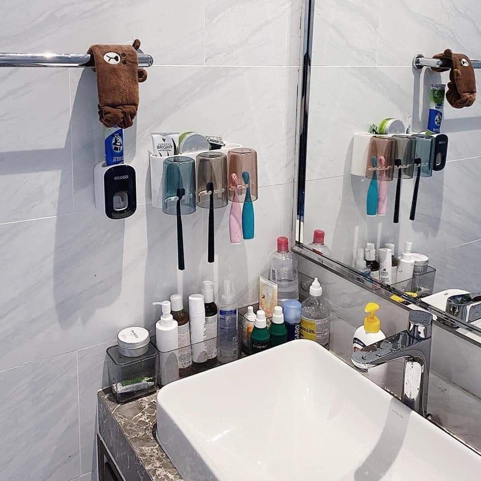 Kệ đồ dùng tích hợp cả kệ để bàn chải - cốc - máy nhả kem đánh răng tự động...rất chi là tiện mà nhìn sang hẳn cái phòng tắm lên lun