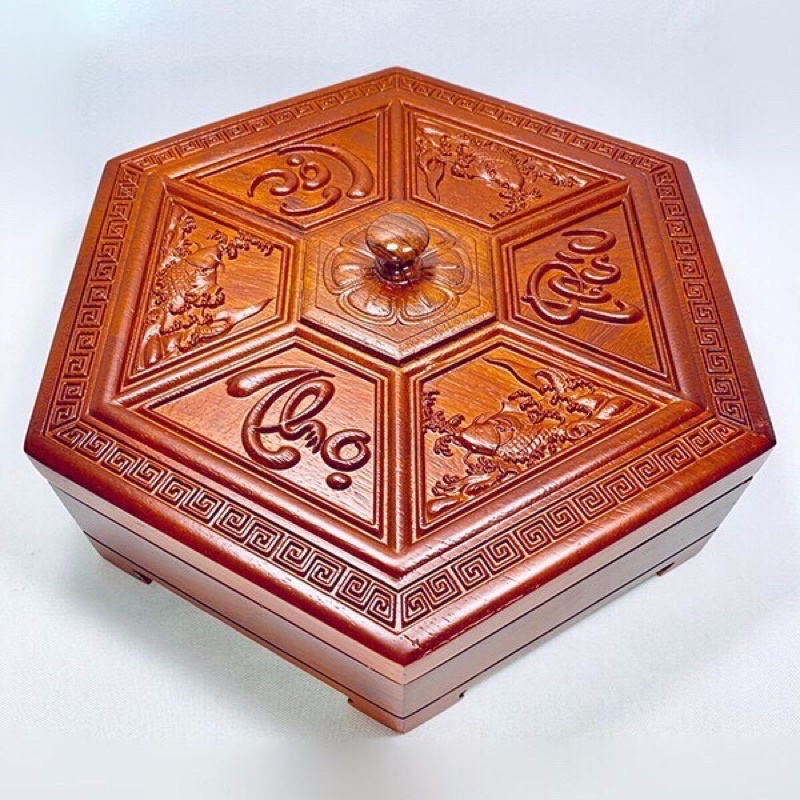 ✔Khay đựng bánh mứt kẹo hình lục giác có 6 ngăn. được có nắp chậm trổ tinh vi đẹp mắt khắc 3 chữ phúc lộc thọ.