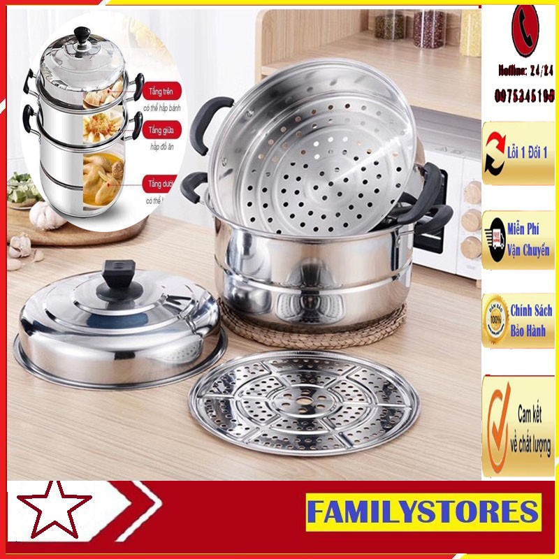 🔖[Free Ship] Nồi Hấp inox 3 Tầng Cỡ Lớn-Bộ nồi hấp inox Steamer Size 28cm Đa Năng Cao Cấp Dùng Cho Mọi Loại Bếp 🔖Đồ xôi, hâm nóng thước ăn, luộc gà cùng lúc siêu tiết kiệm.