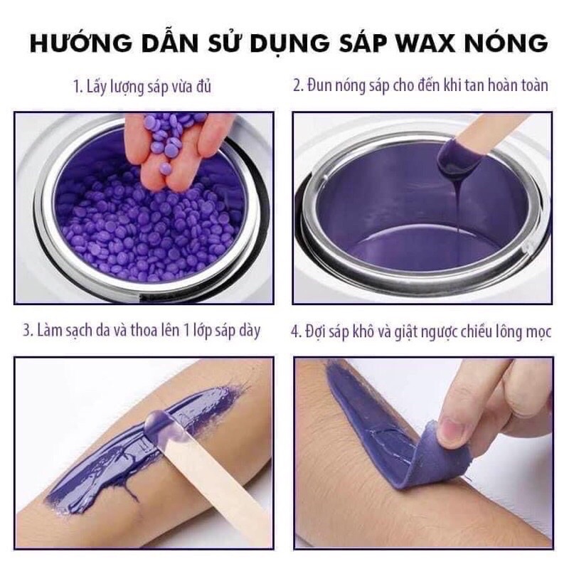 - Lấy 1 lượng hạt bỏ vào trong nồi nấu sáp wax chuyên dụng ---> Hãy thử sáp trên mu bàn tay ( nhiệt độ 40*C là vừa đủ để sử dụng ) tránh quá nóng gây bỏng rát
