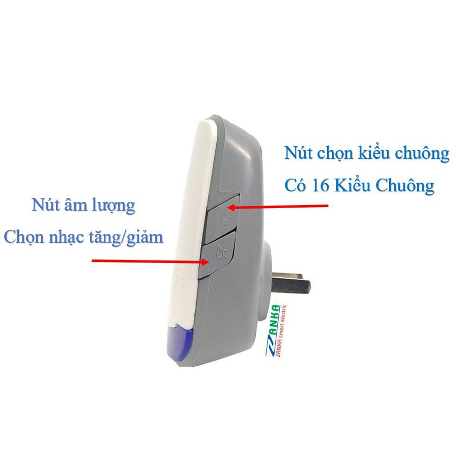 - Nếu muốn tích hợp thêm chuông thì mua thêm 1 chuông mới và cắm vào ổ điện, sau đó dùng ngón tay tay nhấn giữ nút chọn kiển chuông trên chông trong thời gian 6~8 giây thì nghe tiếng phát ra Ting Ting ngay lúc này dùng tay bật công tắc sau đầu cảm ứng từ OFF lên ON sẽ nghe thấy 1 tiếng Ting, chờ tiếp trong 10 giây là thành công. Tương tự có thểm mua thêm Nút Nhấn Chuông ZANKA về làm tương tự và khi nghe 2 tiếng Ting Ting thì bấm vào nút nhấn chông và nghe 1 tiếng Ting là thành công.