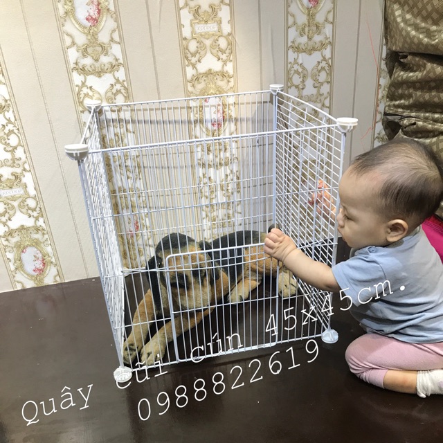 Quây cún đa năng.Bao gồm 12 đen vân 37x 37cm. 3 lưới sắt 37. 37cm và 22 chốt gắn chuồng . Kèm 1 cửa chuồng 37.37cm và 1 búa lắp đặt Lắp ghép theo ý thick tiện dụng, đa năng, dễ di chuyển.