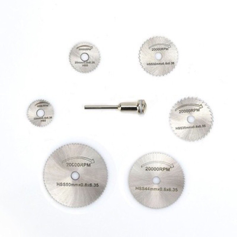 _ Bộ sản phẩm bao gồm 1 trục cán liên kết đường kính 3mm và 6 lưỡi cưa với các quy cách: 22/25/32/35/44/50mm