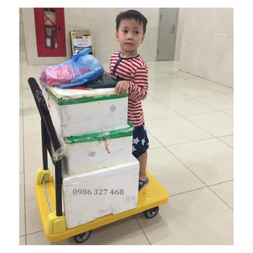 - Xe đẩy hàng với mặt sàn tương đối rộng, bạn có thể để đc hàng hóa nhiều hơn, chất cao hơn mà không sợ rơi nếu dùng dây để chằng hàng vào với khung xe. Xe thích hợp dùng trong thang máy ở các tòa chung cư cao tầng, kho bãi, văn phòng...