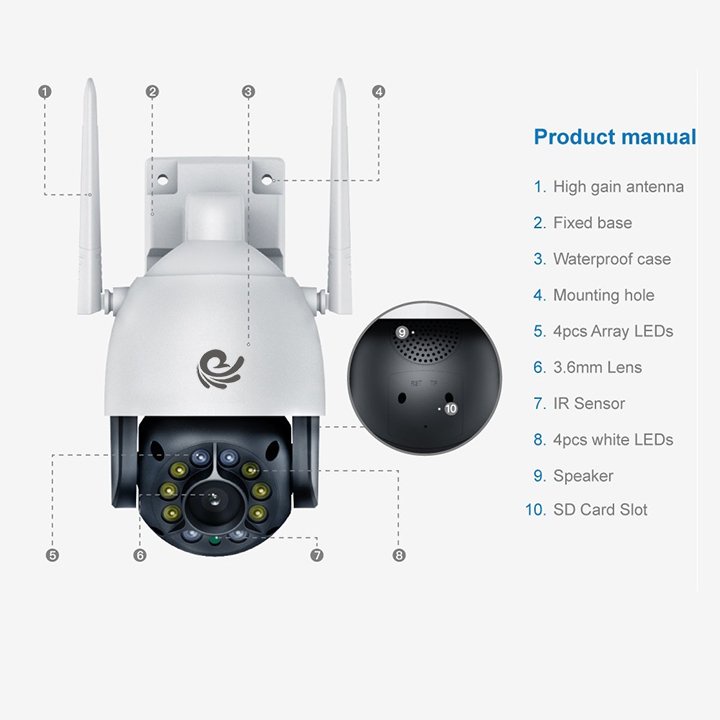 - Tích hơp 4 đèn led trong đó có 2 led chiếu sáng với công suất 20W và 2 led hồng ngoại xem đêm