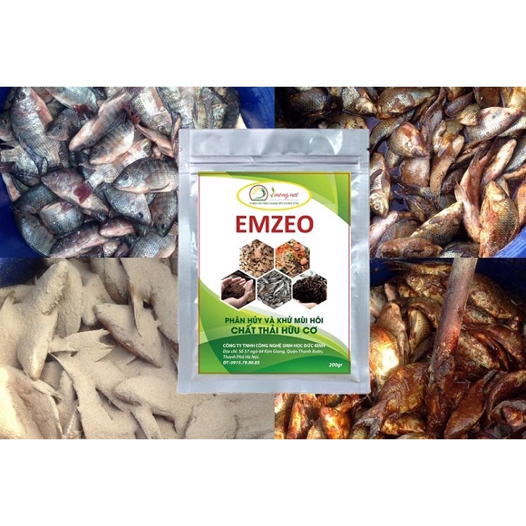 Thành phần: chế phẩm vi sinh Emzeo: hỗn hợp các vi sinh vật hữu ích thuộc các chi: Bacillus sp, Saccharomyces sp ( nấm men), Lactobacillus sp, Actinomyces …có khả năng phân giải mạnh xenluloz, tinh bột, kitin, protein, lipit … có khả năng sinh các hoạt chất có lợi cho môi trường.