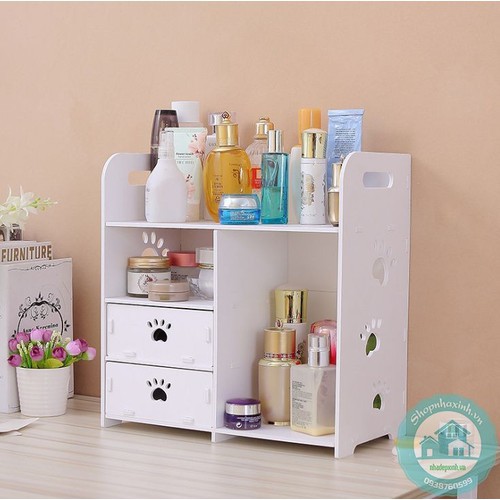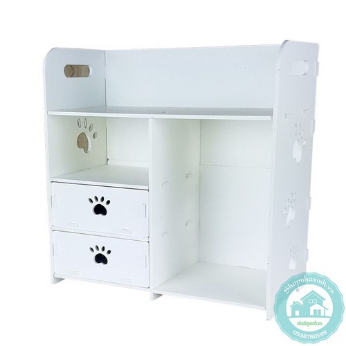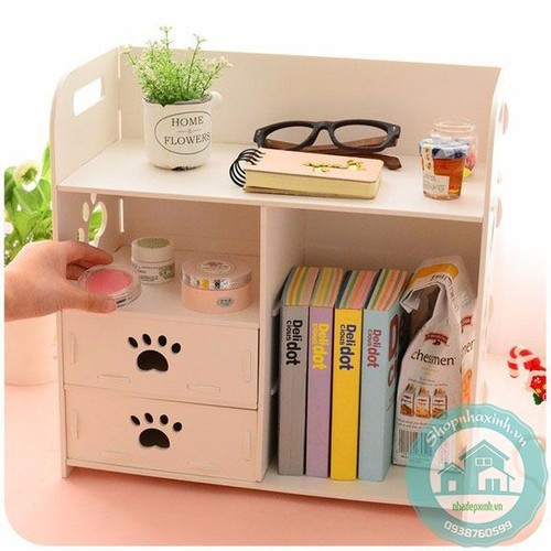 Kệ Đựng Mỹ Phẩm Sách Báo Hình Bàn Chân có 2 ngăn kéo, có cấu tạo từ các miếng gỗ ép được liên kết với nhau một cách thông minh & chắc chắn, có thể tháo rời khi không sử dụng đến cực kỳ tiết kiệm diện tích & tiện lợi khi mang đi xa. Kệ gỗ đa năng được phân chia làm nhiều ngăn giúp bạn để riêng từng món đồ dùng cá nhân vừa đẹp mắt vừa thuận tiện khi sử dụng. Kệ không chỉ mang tính tiện lợi mà còn giúp làm đẹp không gian sống của bạn.Thông tin sản phẩm: