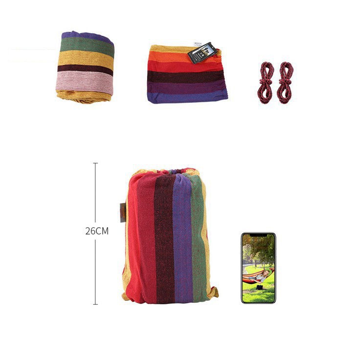 Võng du lịch được thiết kế dáng cầu vồng, 2 đầu dây chắc chắn cùng dây dù đi kèm.
