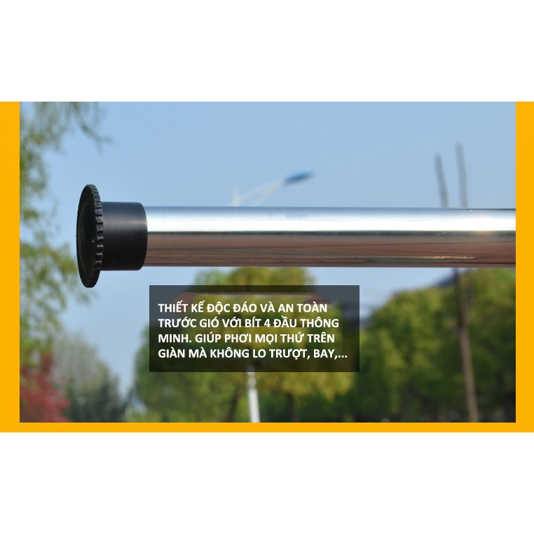 Giàn phơi inox thông minh 2 tầng có bánh xe di chuyểnVới giàn phơi quần áo 2 tầng thông minh sẽ giải quyết một trong những công việc gây mệt mỏi và tốn thời gian của phụ nữ là việc giặt giũ và phơi quần áo cho cả gia đình. Trong đó những khó khăn khi phơi quần áo mà các bà nội trợ thường gặp phải không gian phơi quần áo ít, quần áo hay bị gió thổi bay hoặc dồn vào nhau.Giờ đây, tất cả những bất tiện trong công đoạn phơi phóng quần áo đã được giải quyết với Giàn phơi quần áo thông minh.