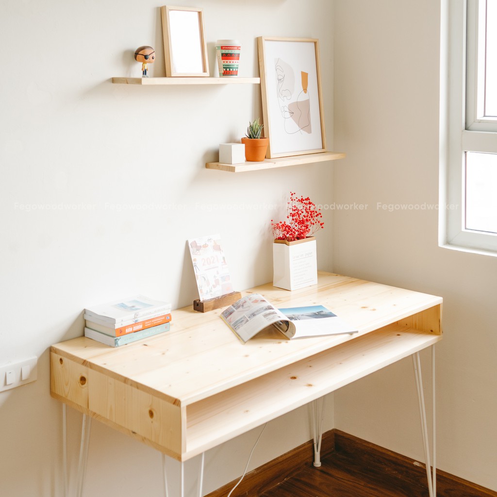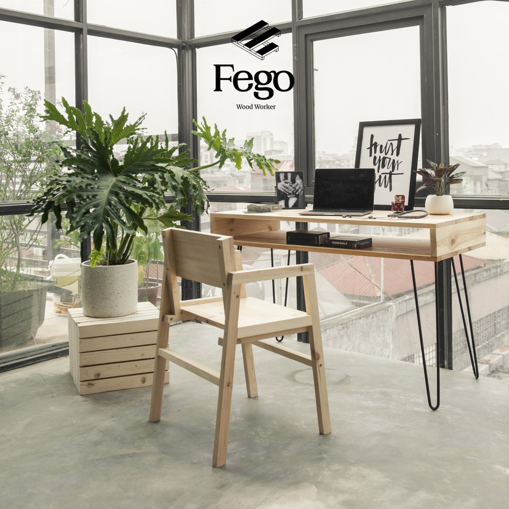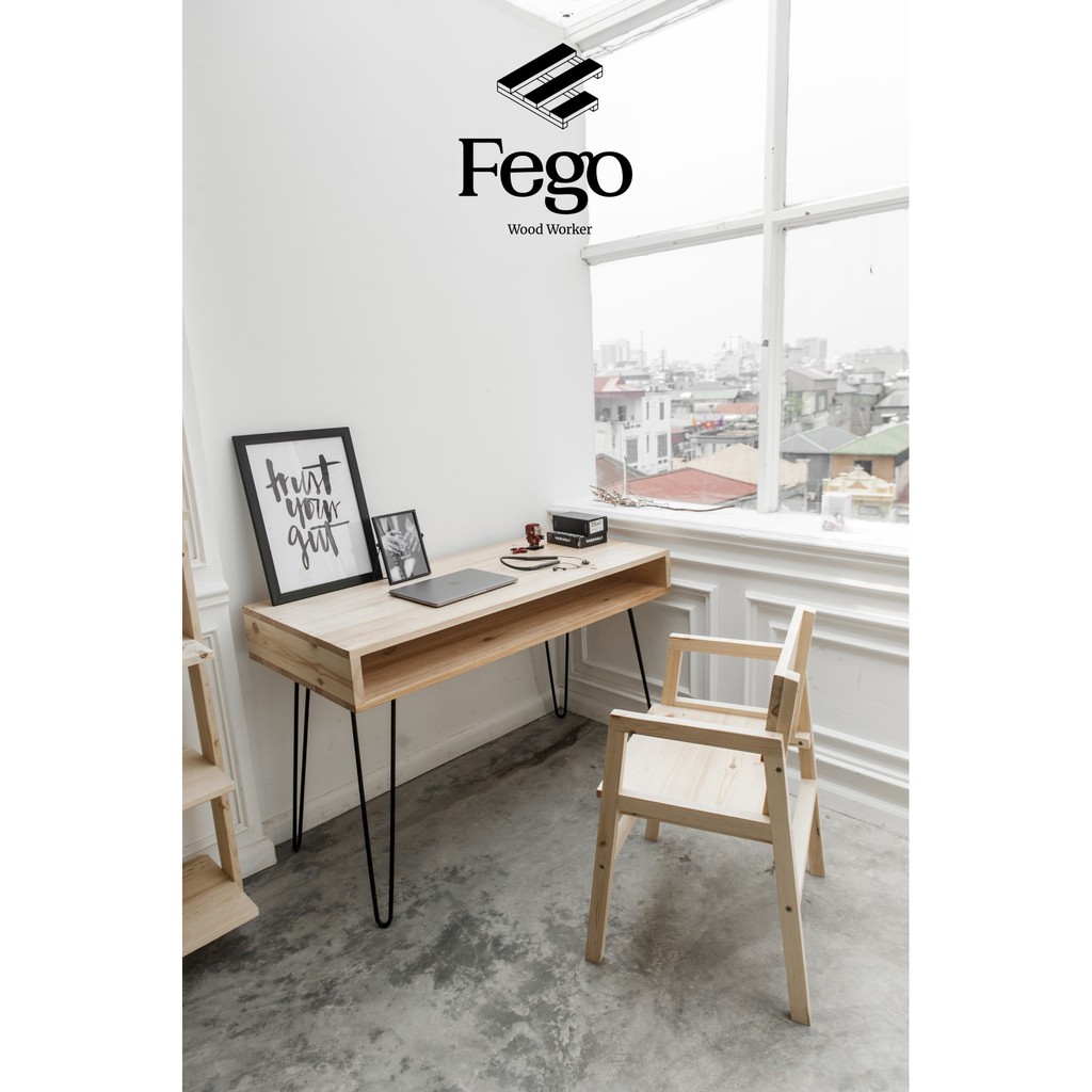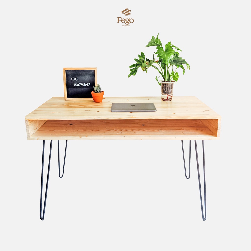 [Freeship HN] Bàn làm việc có ngăn chân sắt hairpin/ Bàn gỗ thông tự nhiên FEGO