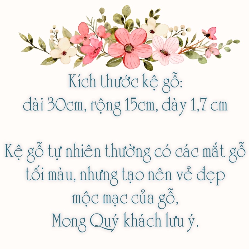 -Sản phẩm bao gồm : Kệ gỗ tự nhiên kích thước dài (30, 40, 50 cm), rộng 15 cm, dày 1,7 cm, dây đã tết như hình nhưng chưa buộc cố định phía dưới kệ gỗ để Quý khách có thể tùy ý căn chỉnh chiều dài theo sở thích, 01 vòng gỗ