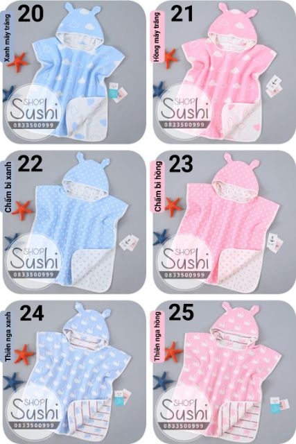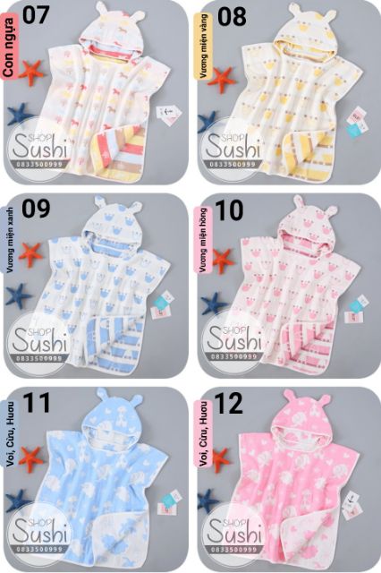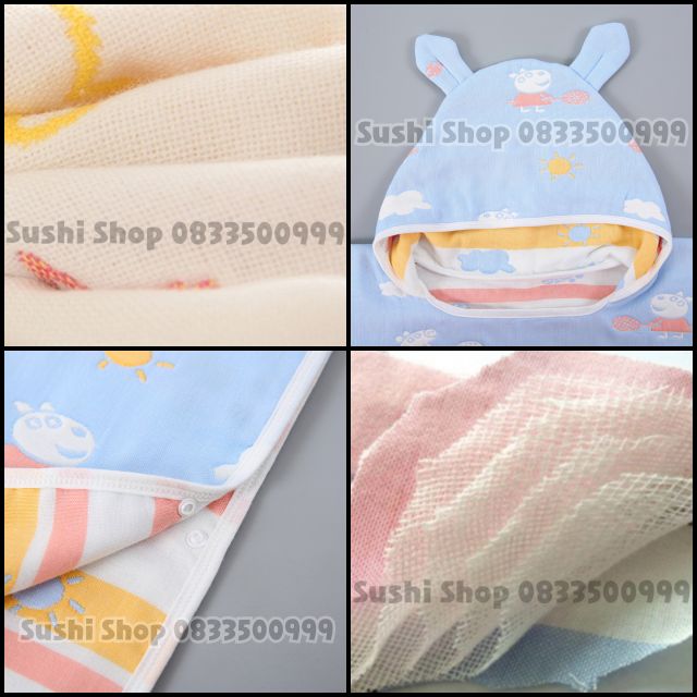 Khăn vải xô 6 lớp loại dày, có mũ trùm đầu.Khách hàng chat với shop nếu muốn chọn hình ạ! ^^